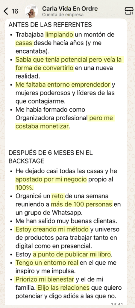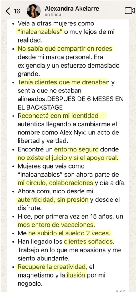 El acceso a El Backstage VIP es la opción que tiene una sesión de unboarding conmigo en tu primer mes. Te enviaré mi calendario para que elijas el horario que te vaya mejor y un formulario para bajar a tierra toda la info que vamos a trabajar. En esta sesión te daré un plan de acción y propuesta para optimizar tu perfil y acelerar las ventas y la conversión.