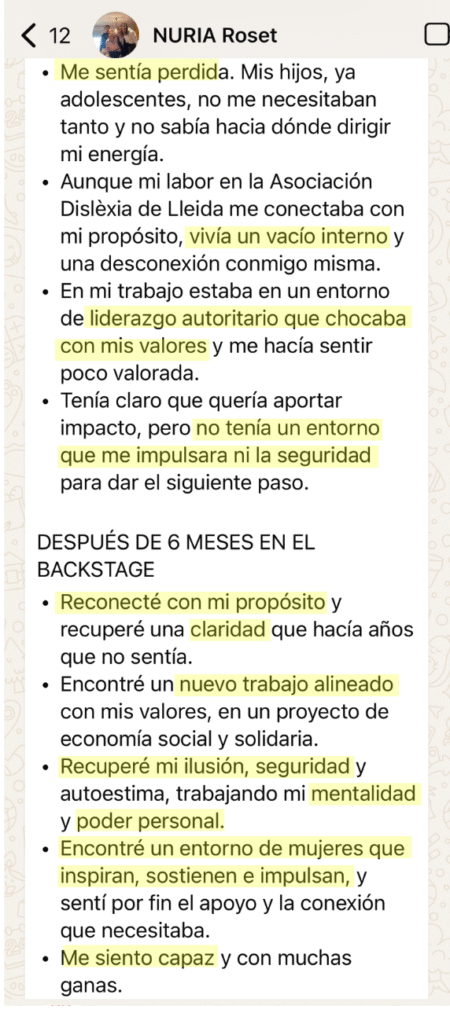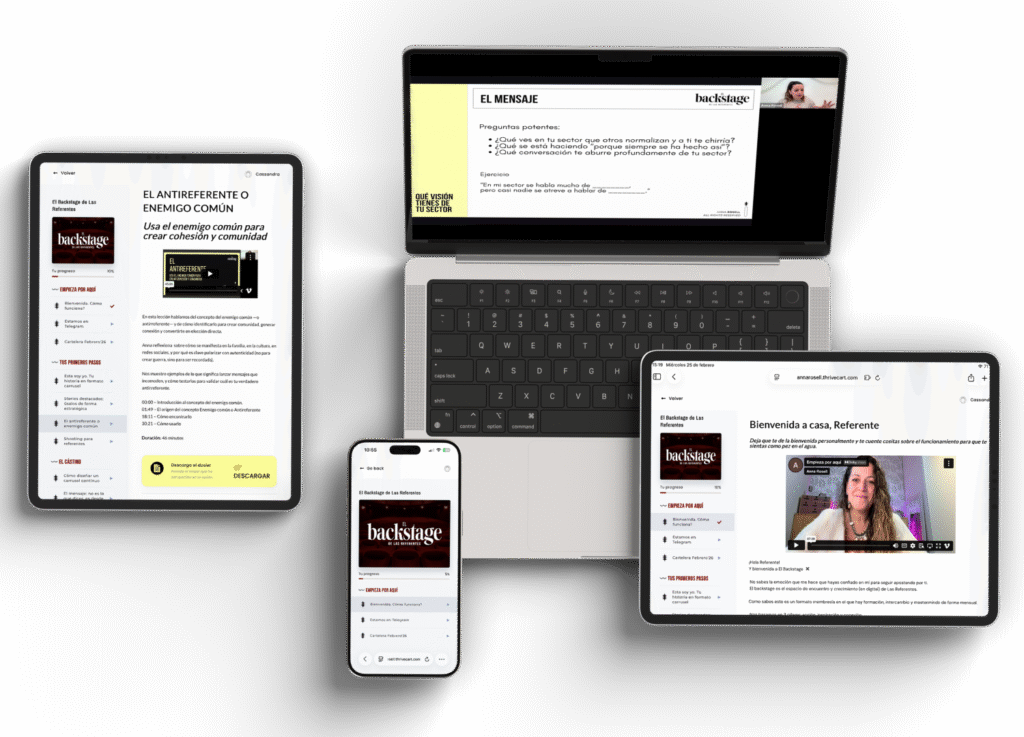 Estar en El Backstage te da acceso a todo el contenido liberado dentro de la plataforma (en directo o grabado). No hay acceso personalizado a Anna, más allá del contacto de las sesiones grupales en directo. Y también tienes acceso prioritario y ventajas exclusivas para las Premiers o experiencias de Las Referentes.